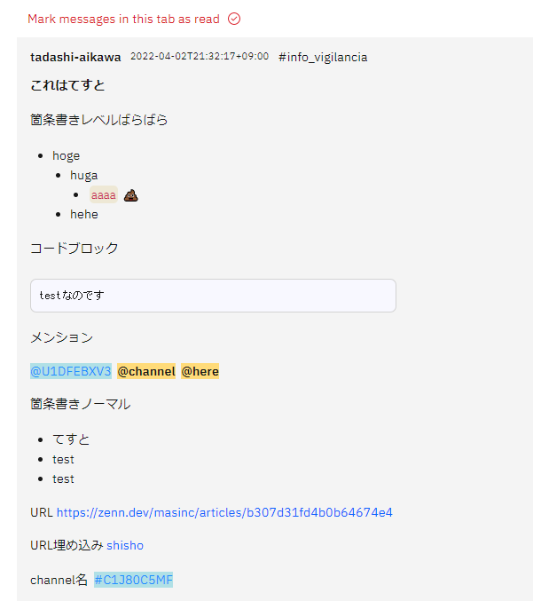 [[Slack]]監視用クライアントの[[🧊Vigilancia]]の開発も順調だ。一番腰の重かった[[Slack Web API]]結果をリッチテキストとして表示する機能についてベースを実装できた。